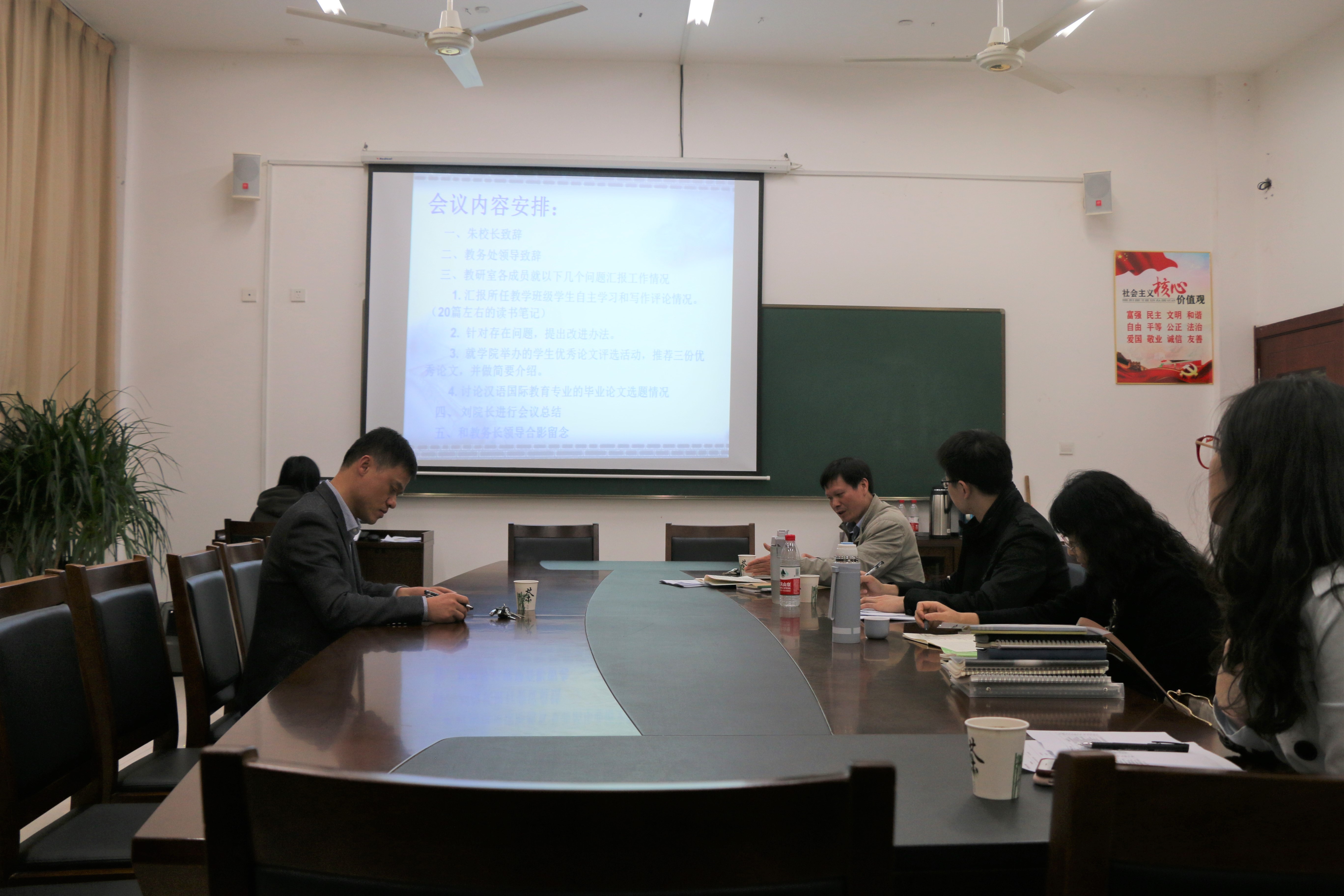 1.汇报所任教学班级学生自主学习和写作评论情况(20篇左右的读书笔记);2.针对存在问题,提出改进办法;3.就学院举办的学生优秀论文评选活动,推荐三份优秀论文,并做简要介绍;4.讨论汉语国际教育专业的毕业论文选题情况。每个老师就自己所任班级情况做了详细报告。